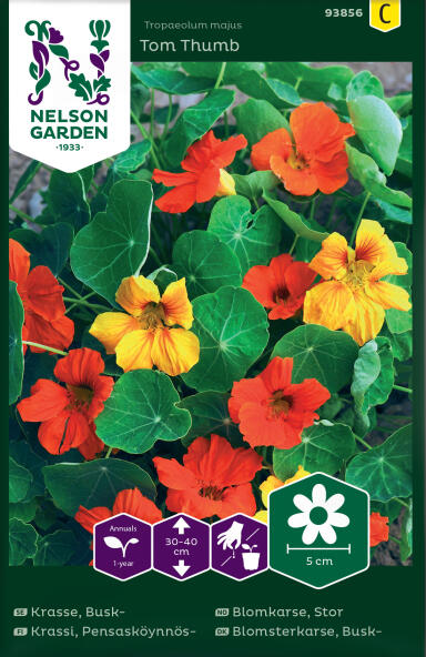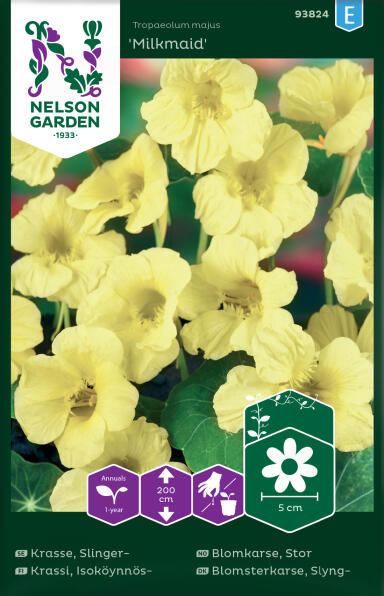 Köynnöskrassin siemeniä on saatavilla myös monenlaisissa siemensekoituksissa. ’Out of Africa’kukkii keltaisen, oranssin ja punaisen sävyissä ja on erityisen upea vihreä-valkoisen lehdistönsä ansiosta.