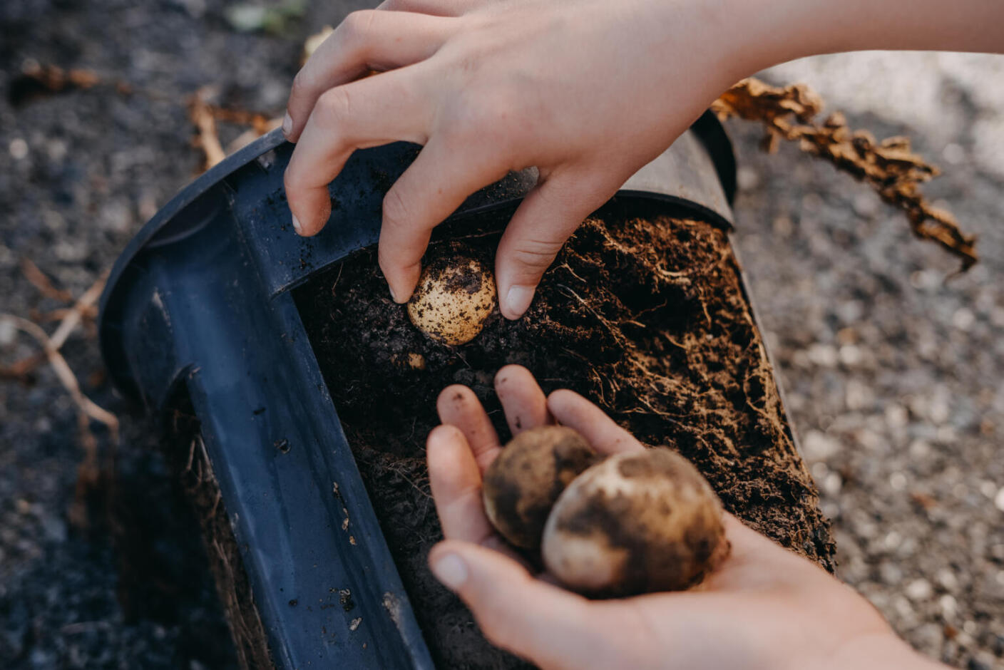 Istutan toiseen ruukkuun kaksi perunaa ja toiseen kolme perunaa. Syynä on se, että käytän kahta eri perunalajiketta. Tuoretta perunalajiketta, joka on valmis korjattavaksi kesän aikana, sekä siemenperunaa, joka on valmis korjattavaksi syksyllä. Tuore perunalajike on hieman pienempi kuin syyslajike. Syyslajike on isompi, minkä vuoksi kaksi riittää ruukkuun.