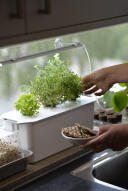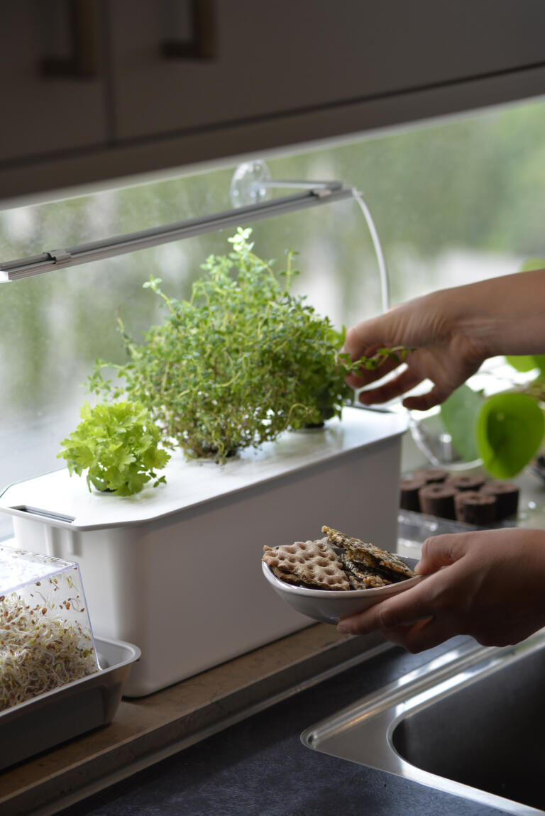 Kun olet täyttänyt laatikon vedellä, asetat vain esikylvetyt kapselit kanteen ja odotat. Jo muutaman viikon kuluttua voit korjata basilika-, salaatti- tai mitä tahansa satoa, jota olet päättänyt kasvattaa.