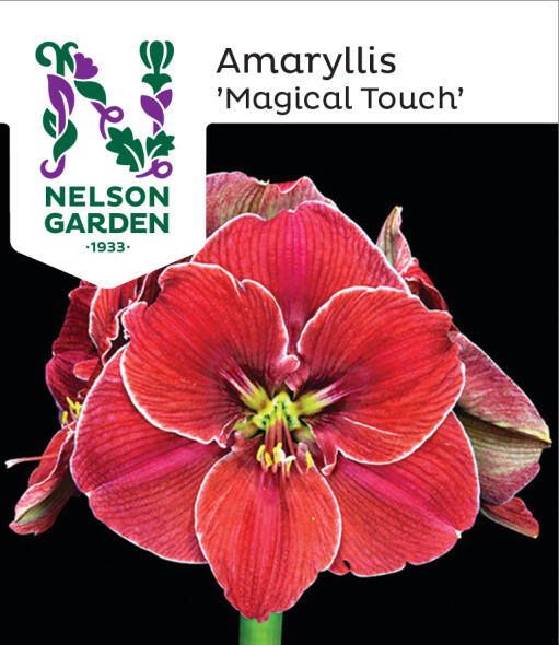 Taianomainen amaryllis, joka samettisissa punaisissa sävyissään kuin muotilehdestä leikattu. Terälehdet ovat suuret ja kauniin muotoiset, ja niitä kiertää valkoinen silkkireunus. Kukan vihreä keskusta on kuin koru. Helppo viljellä, kestävä.