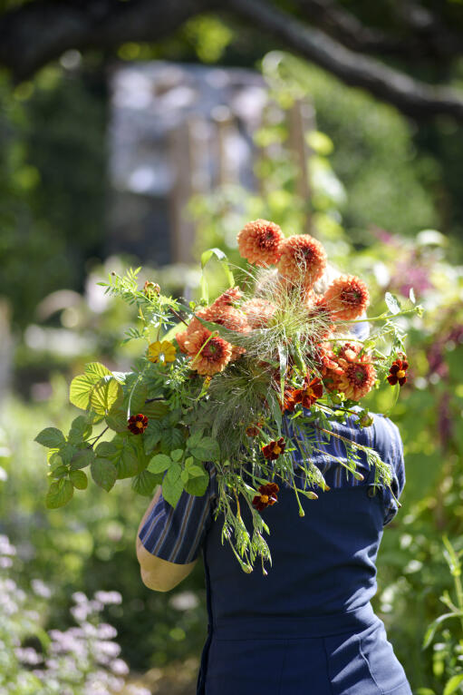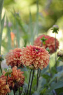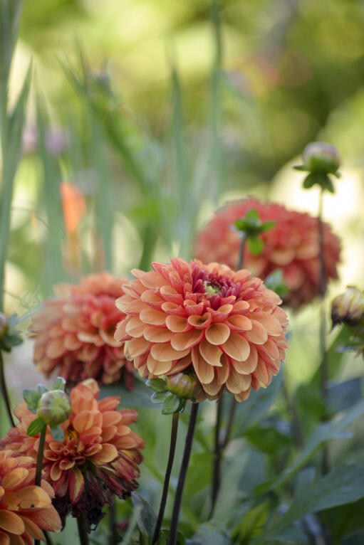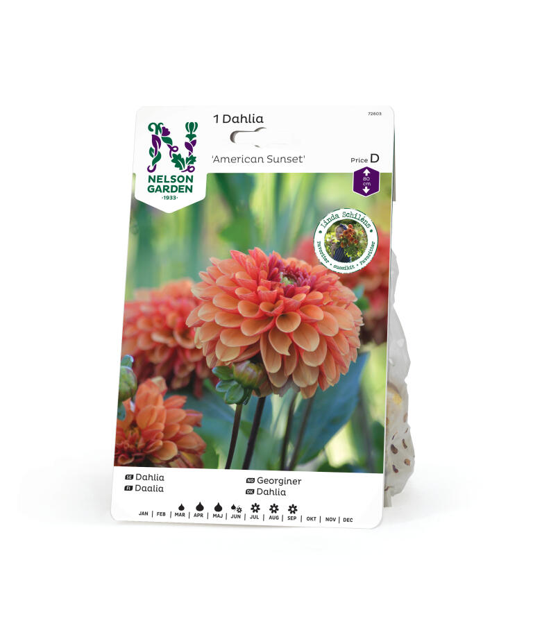 Sievä daalia, jossa auringonlaskun värit – keltainen, oranssi ja tiilenpunainen – yhdistyvät terälehtien etu- ja taustapuolella. Täyteläinen kukka muistuttaa pompondaaliaa, ja ensimmäistä kukkaa seuraa suuri joukko uusia.