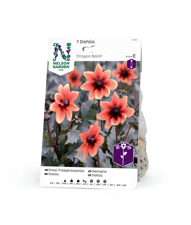 Matala daalia, jolla on eksoottinen väritys; pehmeän oranssin sävyiset kukat tumman vihreitä lehtiä vasten. Kontrastia haluavalle kiinnostava vaihtoehto kukkapenkkiin ja -ruukkuun.