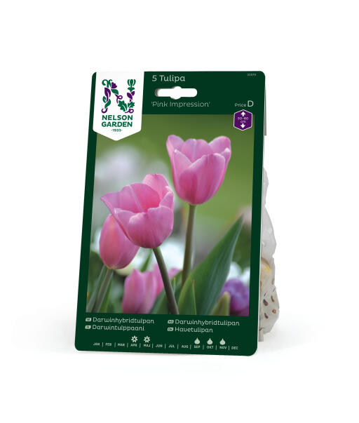 Pink Impression tekee vaikutuksen. Se on yksinkertaisen kaunis darwin-hybridi, joka loistaa vaaleanpunaisen eri sävyissä. Voidaan istuttaa vaikkapa yhdessä pienten helmihyasinttien tai ihanien lemmikkien kanssa.