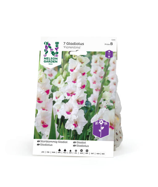 Gladiolus, jonka suurten puhtaan valkoisten kukkien värikontrastina on nielun punainen laikku. Sopii penkkiin, tulisi istuttaa ryhmiksi. Sopii myös suureen ruukkuun ja varsinkin näyttäviin kimppuihin.