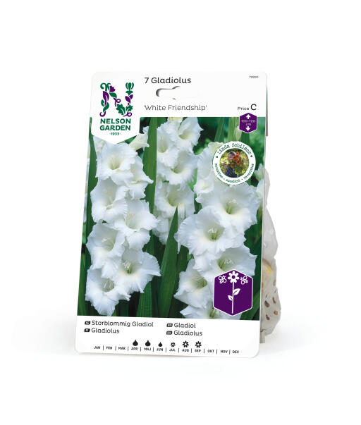 'White Friendship' on suurikukkainen ja laadukas gladiolus. Erinomainen leikkokukka, korjataan alimpien kukkien puhjetessa. Voi tarvita hieman tukea.