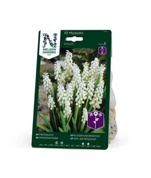 Klassinen helmihyasintti, jonka kukat ovat puhtaan valkoiset. 'Album' on hyvin vanha lajike, josta on mainintoja jo vuodelta 1596. Hyvin kaunis istutettuna samaan ruukkuun esim. roosanväristen tai keltaisten kerrannaiskukkaisten tulppaanien kanssa.