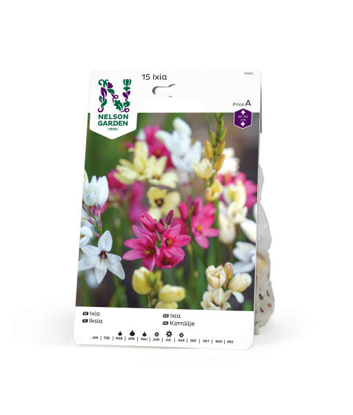 Iksiaa eli afrikkalaista harlekiinikukkaa löytyy useassa pirteässä värissä. Hennot, kellonmuotoiset kukat ovat pitkien vanojen päissä, ja siksi iksia sopii upeasti kimppuihin. Korkeutensa puolesta se sopii myös erinomaisesti kukkapenkin reunaan tai parvekeruukkuun.