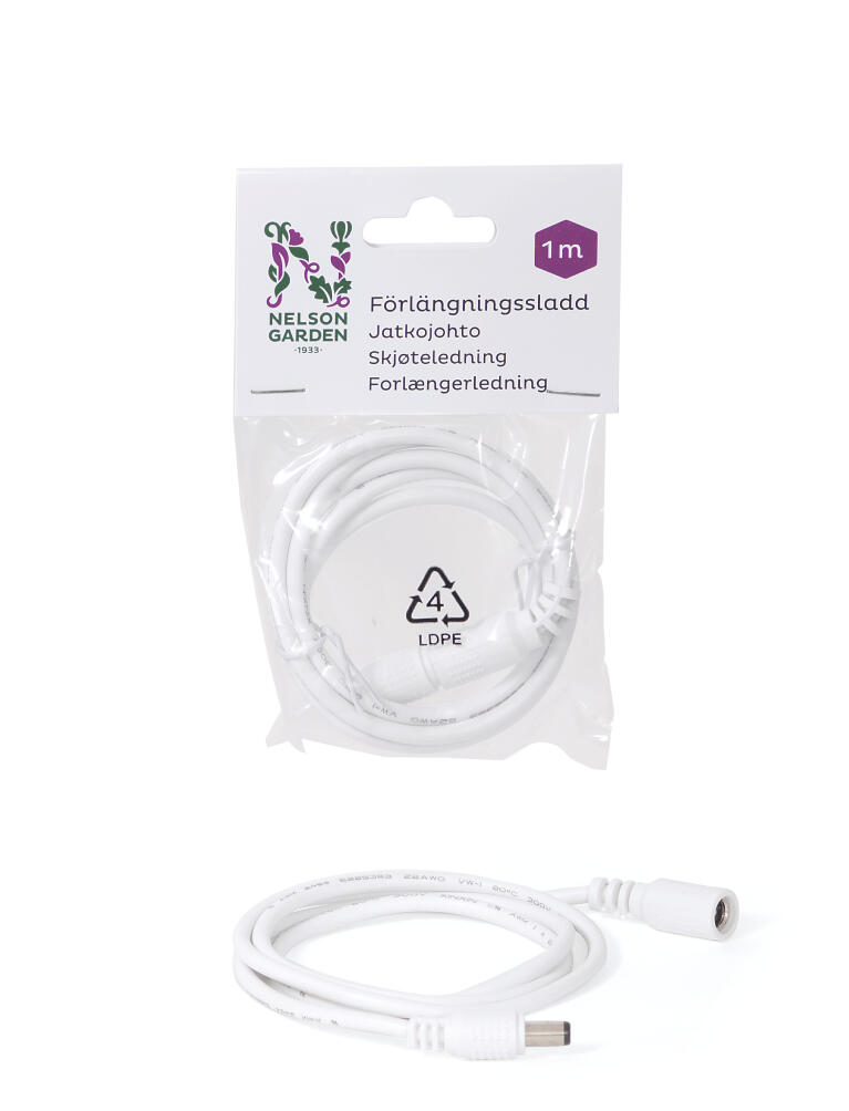 LED-valaisinten liittämiseksi yhteen kauemmas toisistaan, esim. eri hyllyille. Maadoittamaton johto, 1m, DC-tulppa 3,0x6,3mm, max 3A, 12-36 V DC.