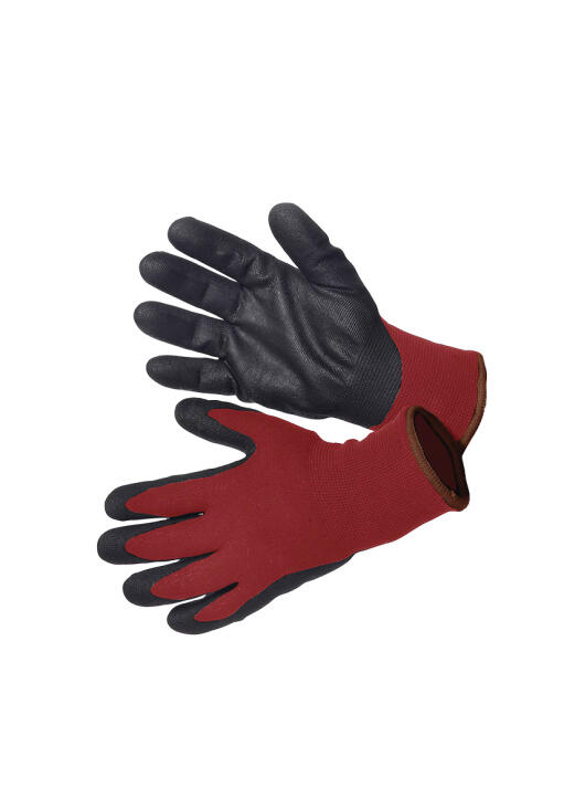 Polyesterineuloksesta valmistetut käsineet, joissa on akryylivuori ja musta nitriilipäällyste. Mukavat ja joustavat käsineet sopivat puutarhatöihin erityisesti kylmällä säällä.