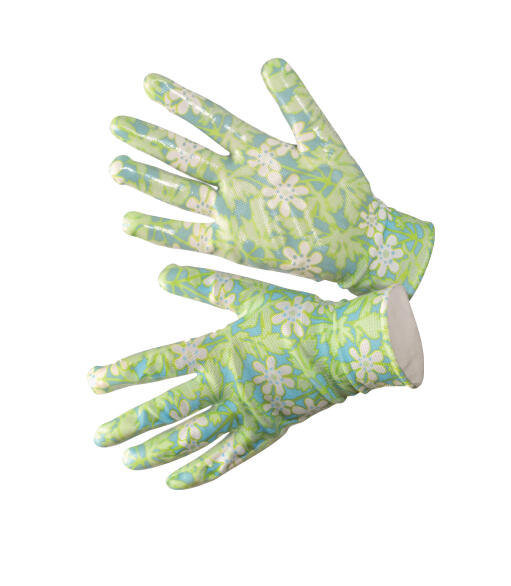 Mukavasti istuvat käsineet erinomaisella näppituntumalla. Saumaton polyesterineulos, jossa on Gunnel Ginsburgin suunnittelema retrohenkinen valkovuokkokuvioinen nitriilipäällyste.