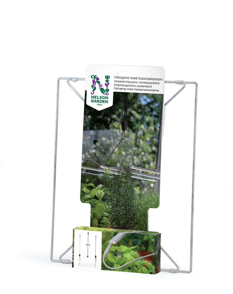 Fiksu ripustusvaihtoehto kolmelle kasvivalaisimelle. Korkeutta säädetään hissimekanismin avulla taimien kasvaessa. Metallia. 40x32cm. Naru polypropeenia (PP) 220cm. Max kuormitus 2kg.