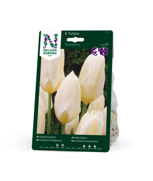 'Purissima'-lajikkeen kukat ovat suuret, soikeat, silkinhohtavan valkoiset ja ihanan tuoksuvat. Kuuluu Fosteriana-ryhmään ja voi viihtyä pitkään puutarhassa. Lajikkeen suomenkielinen nimi on tulitulppaani.