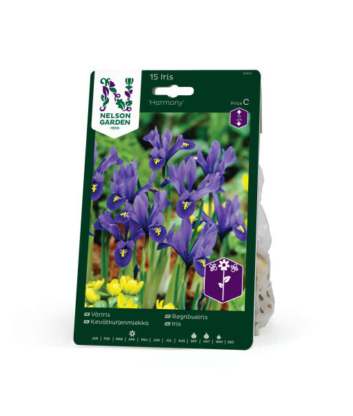 Iris tarkoittaa kreikaksi sateenkaarta. Pieni ja kaunis kevätkurjenmiekka. 'Harmony' -lajikkeella on kirkkaansiniset kukat, joissa on valkoisia ja keltaisia kuvioita. Sopii hienosti esim. kuivaan ja lämpimään kivikkopuutarhaan. Hieno ruukkukasvi.