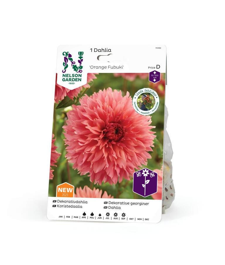 Tämä upea oranssin ja vaaleanpunaisen sävyissä kukkiva koristedaalia tuo näyttävyyttä kesäkimppuun. Sen suuret kerrotut kukat houkuttelevat perhosia puoleensa, ja se sopii erinomaisesti niin ruukkuun kuin leikkokukaksikin.