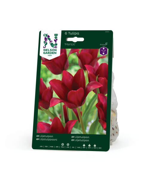 Tämä liljanmuotoinen tyylikäs tulppaani sädehtii auringossa kuin Merlot-viini lasissa. Ympäröivät valkoiset ja keltaiset kukat tuovat esiin sen rohkeaa väriä, mutta vielä rohkeammaksi väri muuttuu oranssien ja limenvihreiden sävyjen seurassa.