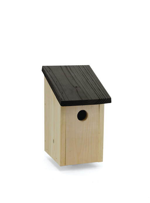 Perinteinen linnunpönttö, jossa on musta vinokatto ja 30 mm reikä. Avattava etupuoli helpottaa puhdistamista. Takaosassa musta pelti kiinnittämistä varten. Höyläämätön sisäpuoli. Valmistettu ylijäämäkuusesta.