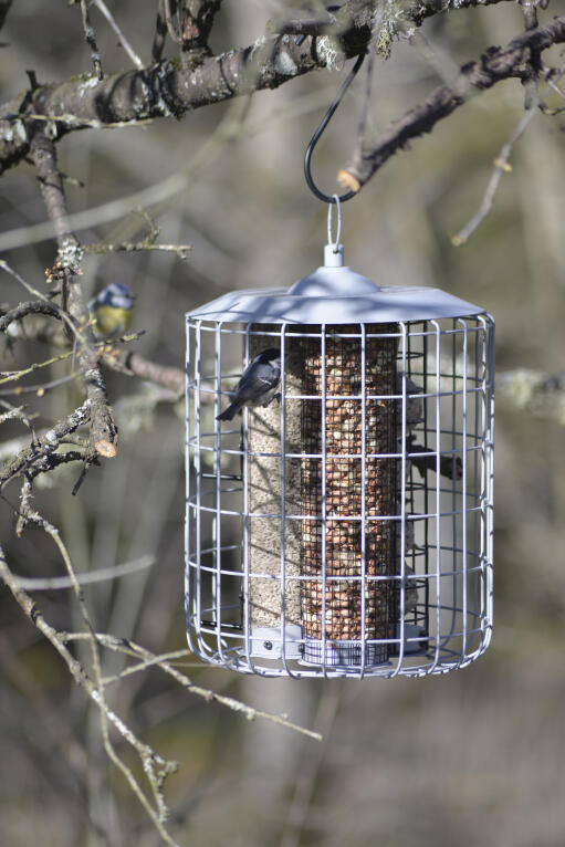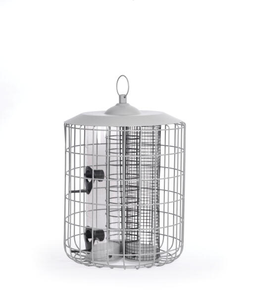 Suuri linnunruoka-automaatti, jonka suojaristikko pitää suuret linnut poissa. Suuri kolmen astian automaatti siemenille, maapähkinöille ja talipalloille (90 g). Jokaiseen astiaan mahtuu n. 1 litra (3x1 litra). Muovia ja metallia. Harmaa. K 34 cm Ø 24 cm
