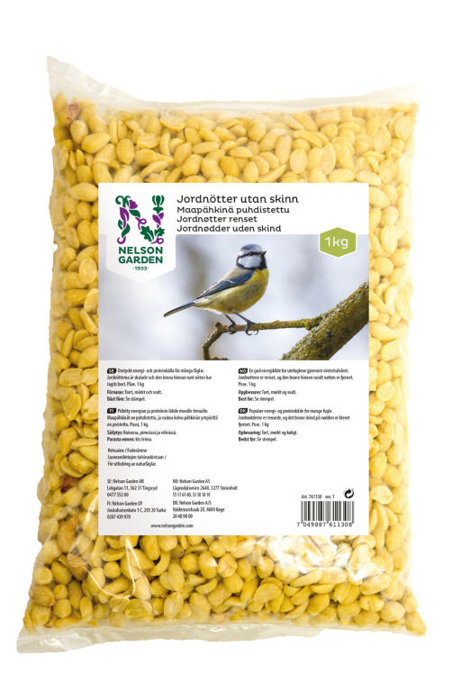 Pidetty energian ja proteiinin lähde monille linnuille. Maapähkinät on puhdistettu, ja ruskea kalvo pähkinän ympäriltä on poistettu. Pussi, 1 kg.