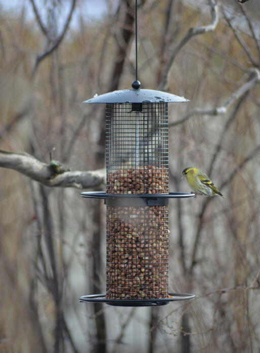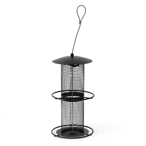 Perinteinen linnunruoka-automaatti pähkinöille. Mustaa metallia, 2 istuinrengasta. Mukana vaijeri ja karbiinihaka. Kork. 35cm Ø18cm.