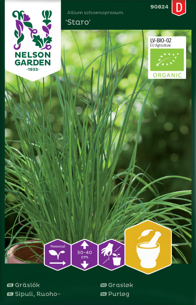 Luomulaatuinen siemen. Ruohosipulin lehdissä on hieno aromi ja mieto sipulinmaku. Kukat liilat, kauniin pyöreät. Korjaa lehtiä vähitellen ja käytä tuoreena salaattiin ja kylmiin kastikkeisiin. Myös syötävät kukat käyvät koristeeksi.