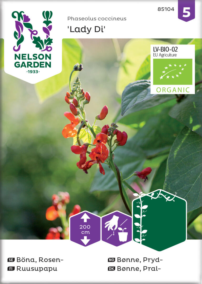 Luomulaatuinen siemen. Kaunis punakukkainen ruusupapu. Kasvata säleikössä, suojaisassa paikassa. Tuottaa runsaan sadon maukkaita vihreitä palkoja, jotka voidaan valmistaa leikkopavun tapaan.