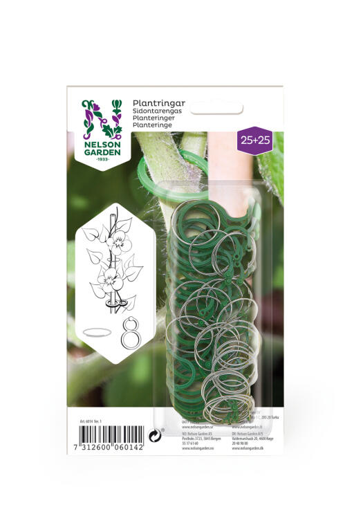 Kaksi erilaista kasvien sidontarengasta, pyöreä metallirengas ja käytännöllinen muovinen 8-rengas. 50 kpl.