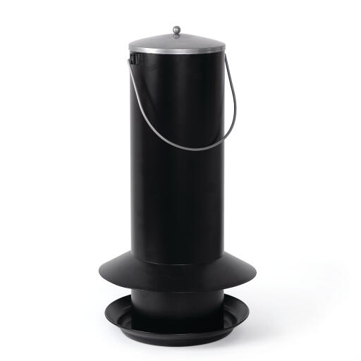 Tilava siemenautomaatti. Jauhemaalattua mustaa peltiä ja suojus, joka pitää kosteuden ja suuret linnut poissa. Ripustin kiinnittämistä varten. Tilavuus 7 l. Kork. 48cm Ø24cm