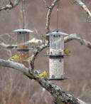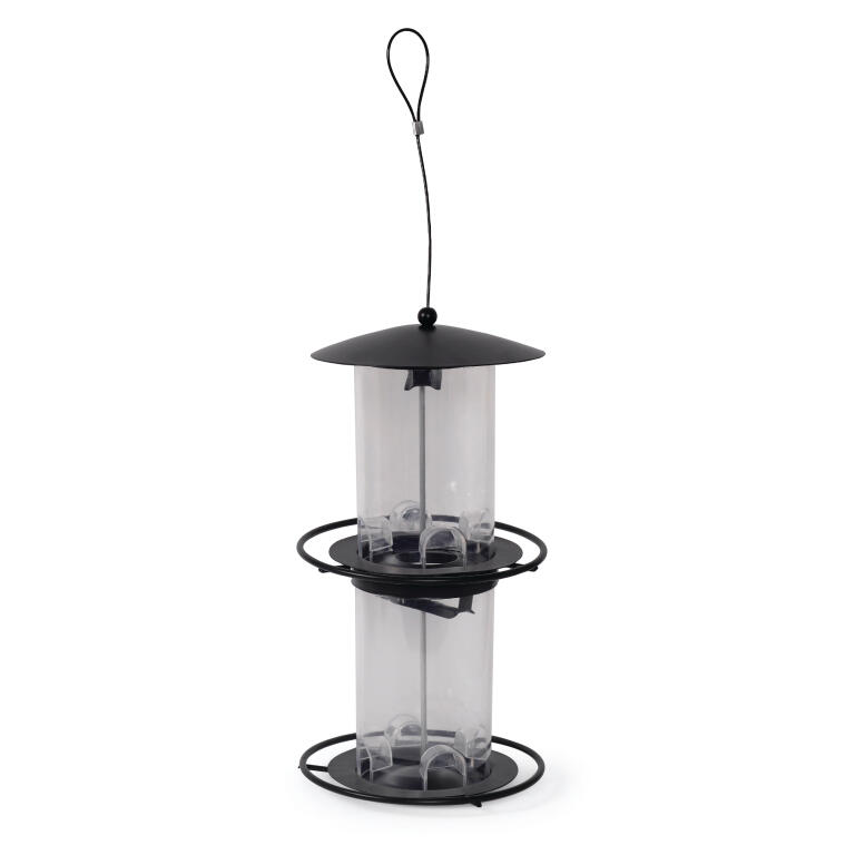 Perinteinen linnunruoka-automaatti linnunsiemenille. 8 ruoka-aukkoa ja 2 istuinrengasta. Pidike polystyreeniä, muut osat mustaa metallia. Mukana vaijeri ja karbiinihaka. Kork. 35cm Ø18cm.