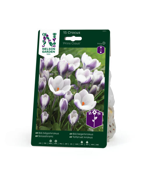 'Prins Claus' on sininen pikarikrookus, jolla on suuret valkoiset kukat. Ulkoterälehdissä on sinivioletteja täpliä. Sopii kukkapenkkiin, pensastojen ja pensasaitojen reunustoille sekä puiden eteen kevätaurinkoon. Kaunis epäsymmetrisinä ryhminä harvassa ruohikossa.
