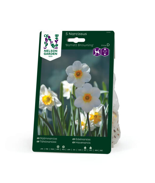 'Barrett Browning' on tähtinarsissi, joka kuuluu pienikruunuisten ryhmään. Lajikkeella on valkoiset yläterälehdet ja voimakkaan oranssinvärinen lisäkruunu. Lajike ei juurikaan maistu kauriille, jäniksille, kaneille ja myyrille.