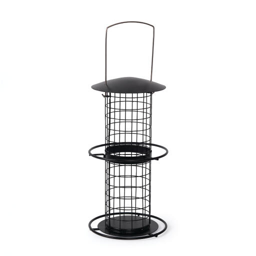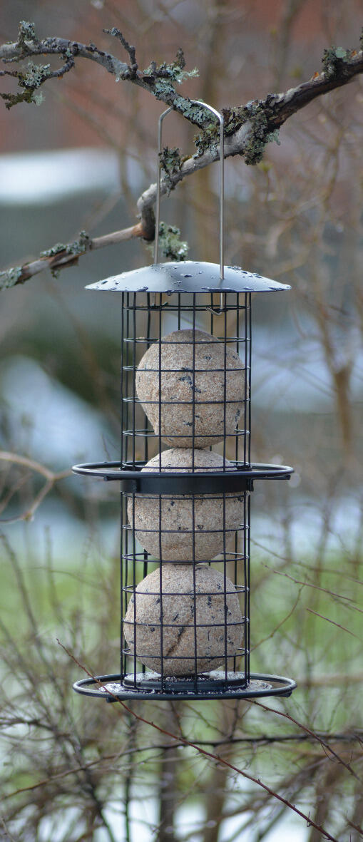 Perinteinen linnunruoka-automaatti suurille ja pienille talipalloille (480g ja 90g). Mustaa metallia, 2 istuinrengasta. Ripustin kiinnittämistä varten. Kork. 35cm Ø 18cm.