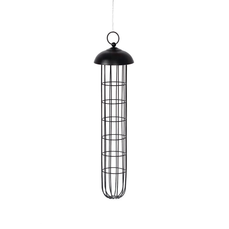 Kätevä linnunruoka-automaatti, johon mahtuu seitsemän 90g talipalloa. Helppo täyttää ja puhdistaa. Tässä useampi pikkulintu pääsee syömään yhtä aikaa. Mustaa metallia, kork. 45cm Ø 10cm