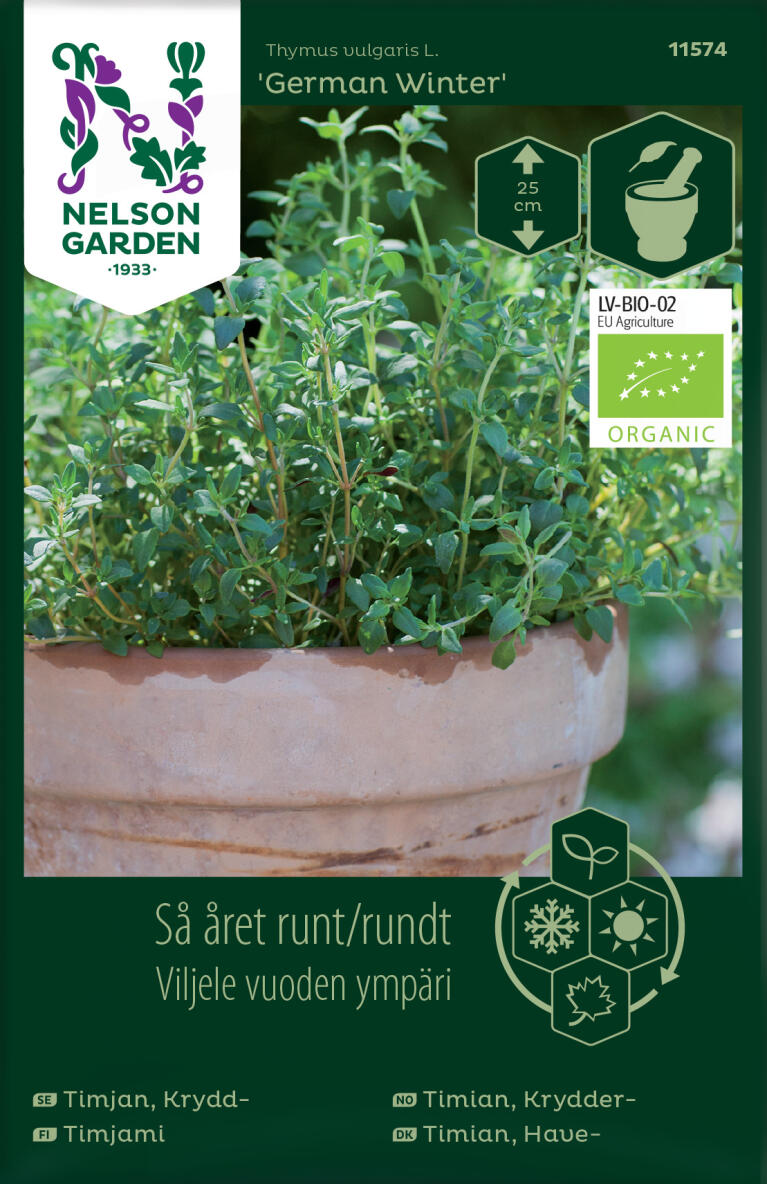 Ikivihreä monivuotinen timjami, joka kestää kuivuutta. Esikasvata sisällä kylvömullassa kasvivalon alla. Idätä huoneenlämmössä, siirrä viileämpään. Taimettumisen jälkeen kouli 2/ruukku lannoitettuun multaan. Suorakylvö avomaalle mahdollinen. Aloita korjuu n.10vkoa kylvöstä. Lehdet käytetään tuoreena/kuivattuina.