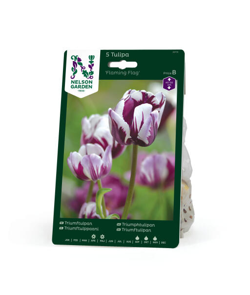 'Flaming Flag' on korkea tulppaani, joka huojuu tuulessa liilan ja valkoisen väreissä. Kukkii pitkään ja on kestävä sekä kukkapenkissä että kevään tyylikkäissä kukkakimpuissa.